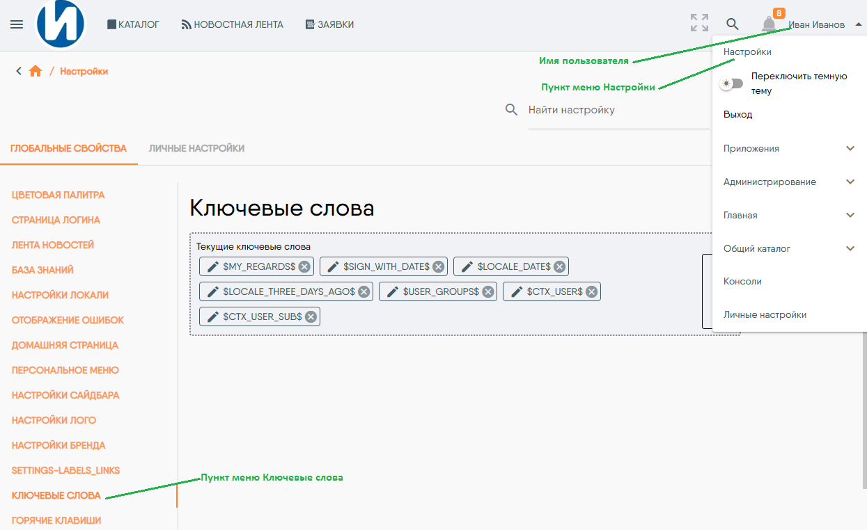 В правом верхнем углу нажать поле с именем пользователя, в всплывающем меню выбрать пункт Настройки и в левом нижнем углу нажать пункт меню Ключевые слова (Рис. 5.15.1). Откроется форма настройки «Ключевые слова».