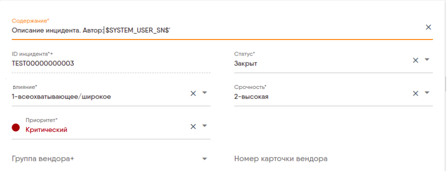 Здесь в поле «Содержание» использовано ключевое слово $SYSTEM_USER_SN$ во фразе «Описание инцидента. Автор: $SYSTEM_USER_SN$». После сохранения формы и обновления данных в поле «Содержание» будет фраза «Описание инцидента. Автор: Иван Иванов». То есть, ключевое слово при сохранении будет заменено его значением.
